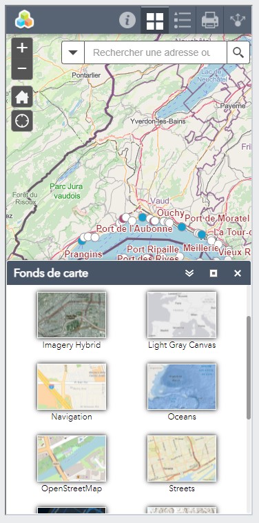 La web map permet de se géolocaliser sur différent fonds de cartes : carte satellite, carte routière, Open StreetMap et autres. Elle contient les fonctions essentielles d’une application cartographique : recherche de lieux, de rue, mesures des distance, légende.